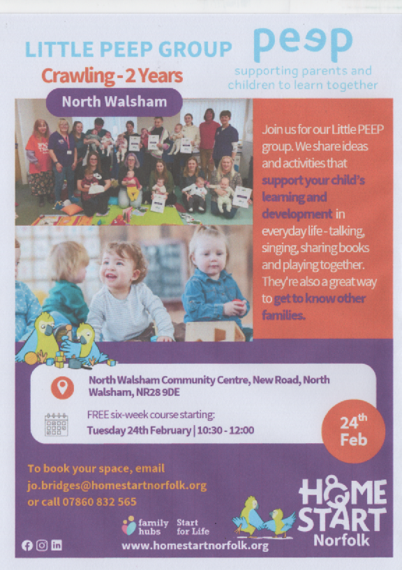 Tuesday 24th February – little peep group 10.30-12 Free six weeks course!! To Book email jo.bridges@homestartnorfolk.org or call 07860 832 565