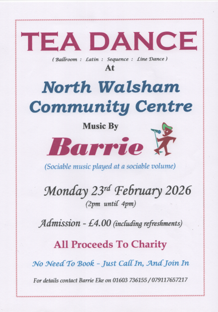 Monday 23rd February – Tea Dance 2-4pm No need to book! Just Call in and Join in! Admission £4 – Contact Barrie 01603 736155/ 07917657217