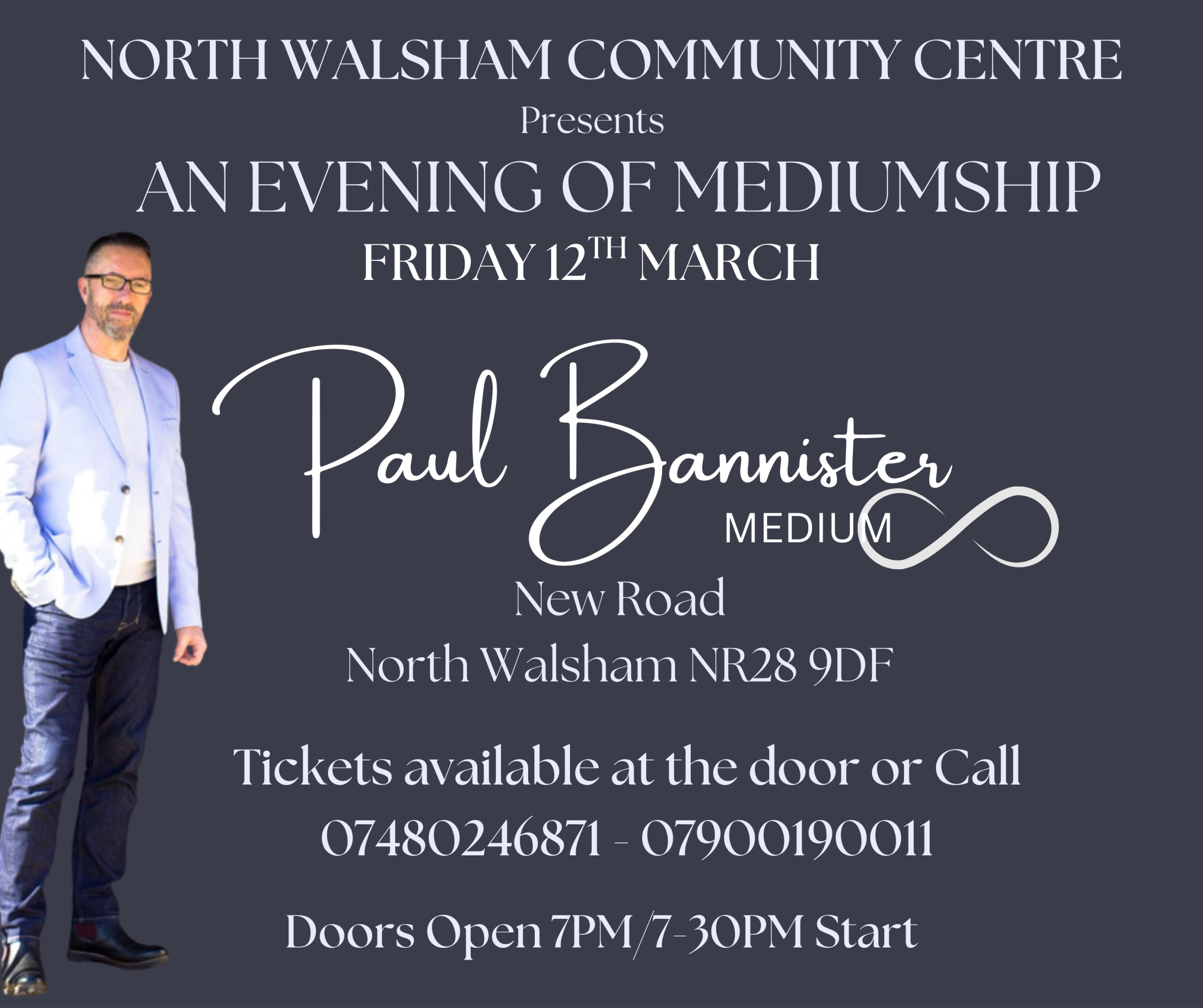 Thursday 12th March – 7-10pm PAUL BANNISTER CLAIRVOYANCE Tickets ON THE DOOR or call 07480 246871 – 07900 1900011